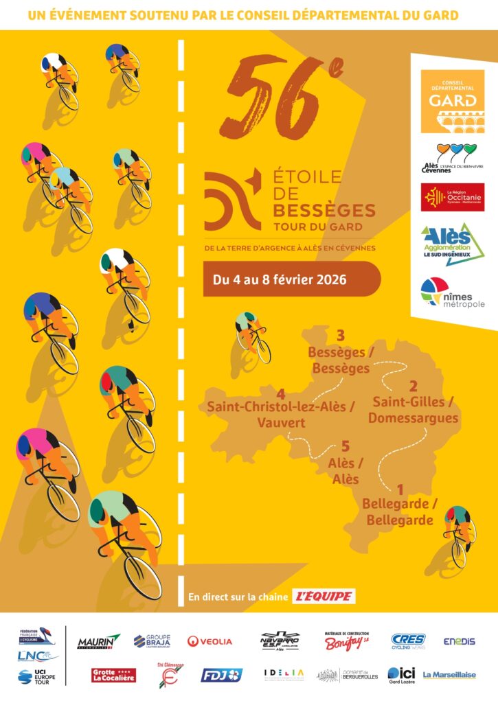 Cette 56ème édition de l’Étoile de Bessèges (Tour du Gard) reliera Saint-Gilles à Domessargues sur un parcours de 162 km.